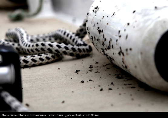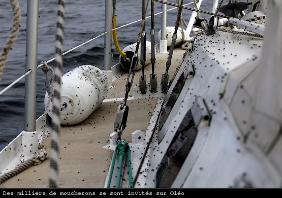 Alors que nous nous baladions sur Oleo au large de Barfleur, ma chère et tendre, sa soeur Hélène et moi-même, nous avons eu la surprise (assez désagréable) d’accueillir des milliers de moucherons à bord.