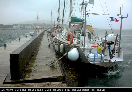Dans l’après-midi le vent se met à souffler avec une rare violence. 20m de fetch suffisent à soulever un clapot déferlant, heureusement je suis du bon côté du ponton et Oléo est stable. Je double les amarres. Avec ce que l’éolienne me fournit en courant j’ai de quoi alimenter le frigo, l’ordinateur via le convertisseur 220v, la radio et l’éclairage avec en prime une charge rapide des quatre batteries.
