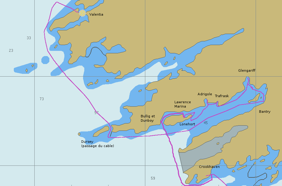 Cela fait plaisir, en arrivant à l’Est de Valentia, de retrouver un plan d’eau plat. Je ne sais pas où aller et décide que si je ne trouve pas mon bonheur parmi les bouées ça sera le port dans la rivière, un peu plus loin.