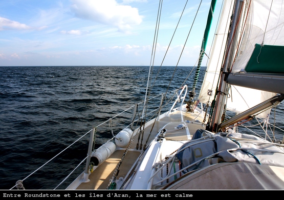 Peu après une pétole complète s’installe, mais heureusement la mer est plate. Je me sens comme dans un bon mouillage : bateau immobile, avec quelques oiseaux et dauphins qui me tournent autour. Deux heures après je décide de pousser 10 minutes au moteur, mon vent d’Ouest (pas du tout prévu par la météo) forcit pendant 2 heures et me revoilà dans la pétole au large de la baie de Brandon.