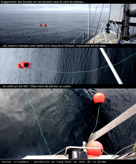 Entre temps j’aperçois sur ma route un casier doté de sa bouée rose et d’un orin. Pour prendre une photo je m’approche jusqu’à apercevoir le bout flottant qui relie la bouée au piège qui se trouve sous l’eau. Oléo passe dessus tout doucement, le cordage passe facilement sous les quilles mais reste bloqué par le protège-safran. Un coup de gaffe sera nécessaire pour le dégager.