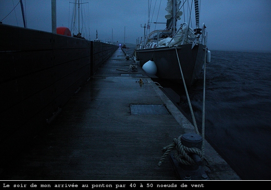 Dernière épreuve : arriver à s’amarrer seul dans ces conditions. A mon grand regret le coup de vent se maintient au moment où j’arrive au quai. Je décide de prendre l’unique place abordable dans de telles conditions, située parallèlement au flux d’air. Je manoeuvre face au vent et c’est pas facile car au moindre écart Oléo se met à virer violemment à cause de son fardage. Rétablir la position du bateau nécessite de pousser le moteur à fond.